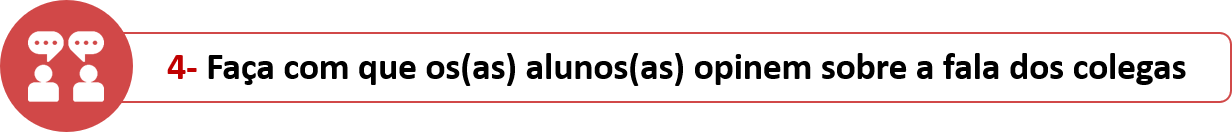 Ao ter algum comentário feito por um aluno como resposta a um questionamento realizado, o/a professor/a pode chamar outro colega e dizer “Kátia, você concorda com o Alex? Em que ponto você discorda dele?”