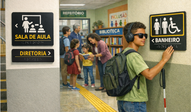A inclusão de estudantes com baixa visão ou deficiência visual é uma parte essencial da comunicação visual nas escolas, pois garante que todos/as possam se orientar e participar plenamente no ambiente escolar. Para isso, é fundamental que a sinalização e os materiais visuais sejam adaptados para contemplar recursos de acessibilidade, como o uso de textos em Braille, ícones táteis e alto-contraste nas cores, que facilitam a identificação dos espaços e dos conteúdos. Além disso, indicações sonoras em áreas específicas podem auxiliar na circulação de estudantes com deficiência visual, promovendo um ambiente mais inclusivo e seguro. Essa adaptação amplia a sensação de pertencimento dos/as estudantes, ao mesmo tempo que reforça o papel da escola em atender às necessidades de todos, sem exceção.